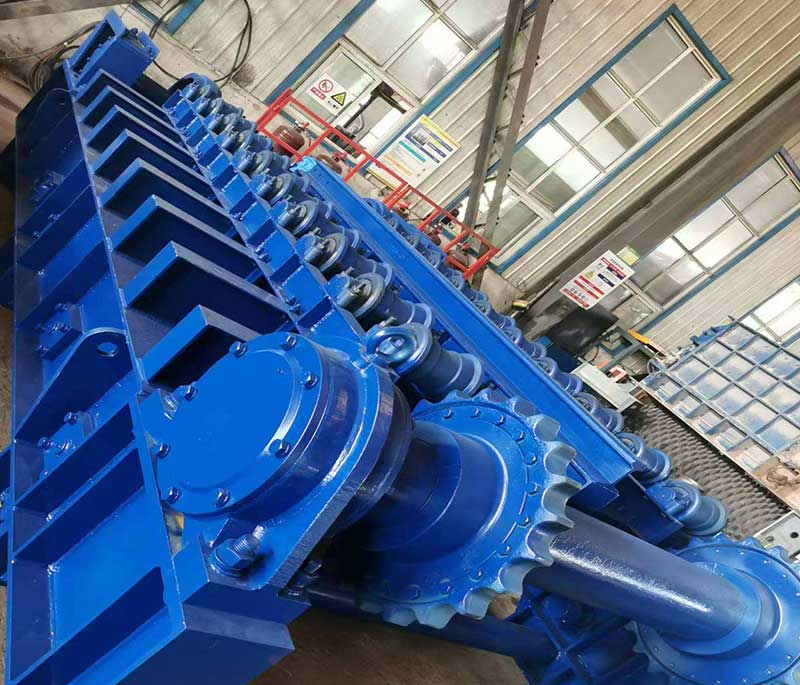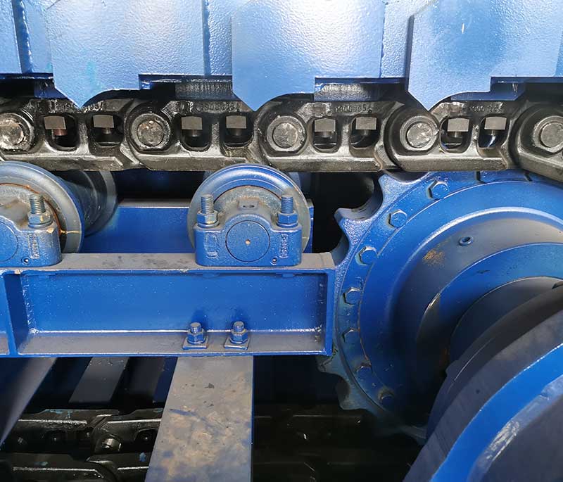 La transmission de puissance commence par un moteur électrique (généralement de 15 à 500 kW) qui fournit de l'énergie rotative à un réducteur d'engrenages. Ce réducteur convertit les signaux d'entrée à grande vitesse et à faible couple en signaux de sortie à faible vitesse et à couple élevé, nécessaires pour entraîner des charges massives. Le couple est transféré via des accouplements à des pignons, qui s'engagent dans des chaînes à rouleaux robustes.